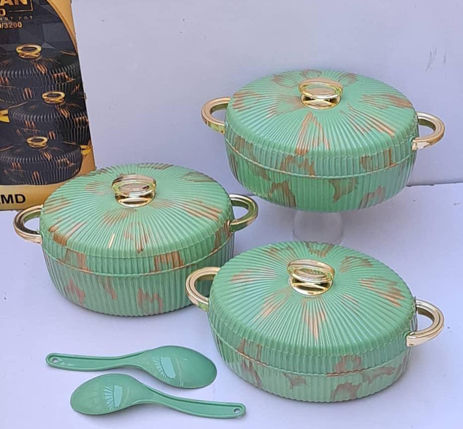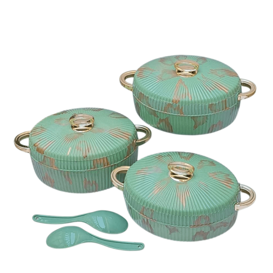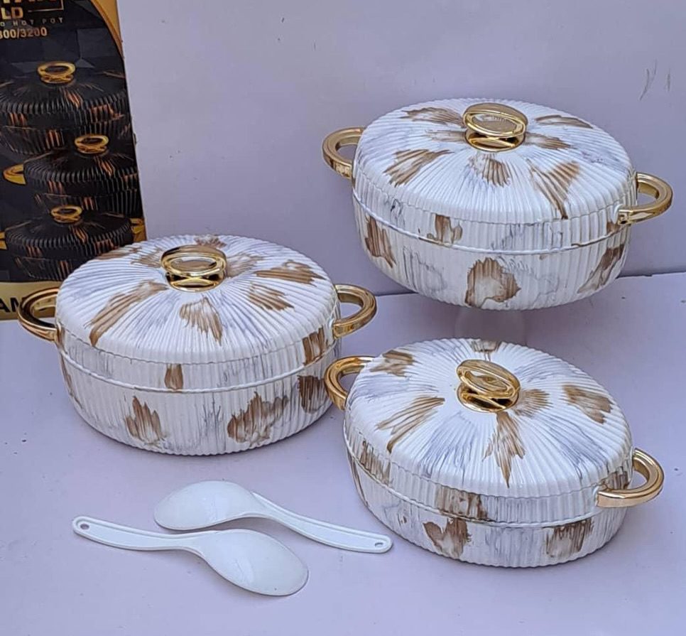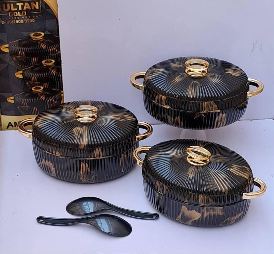 حافظات طعام تصميم رخامي أنيق وفاخر عالية الجودة صناعة هندية مؤلفة من 3 قطع مع أغطية ومقابض ذهبية عصرية مع معلقتين .