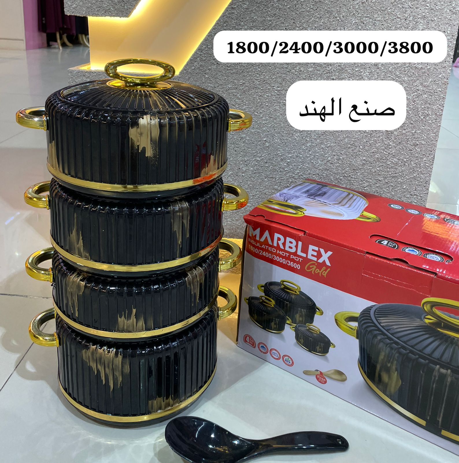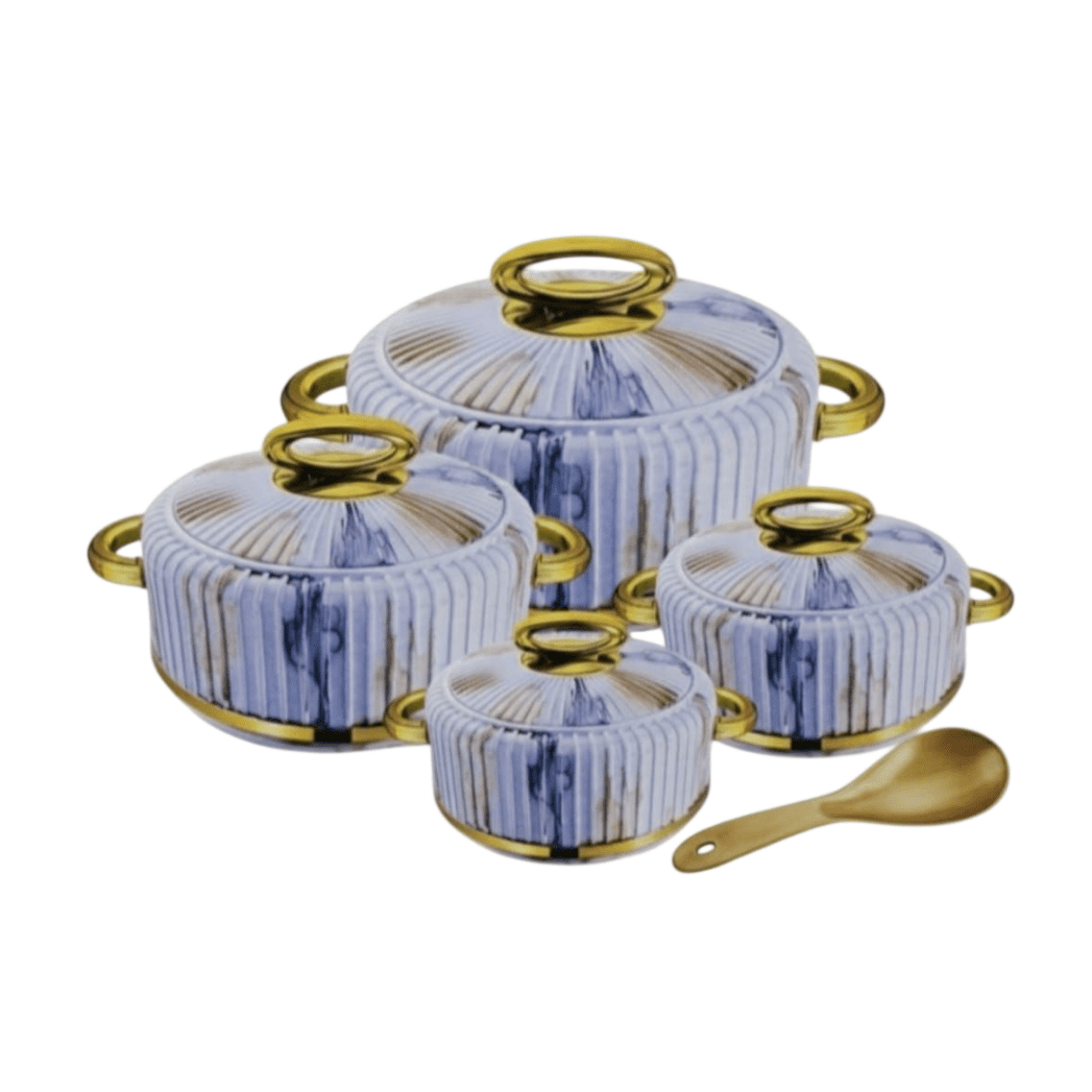 حافظات طعام تصميم رخامي أنيق وفاخر عالية الجودة صناعة هندية مؤلفة من 4 قطع مع أغطية ومقابض ذهبية عصرية مع ملعقة هدية .