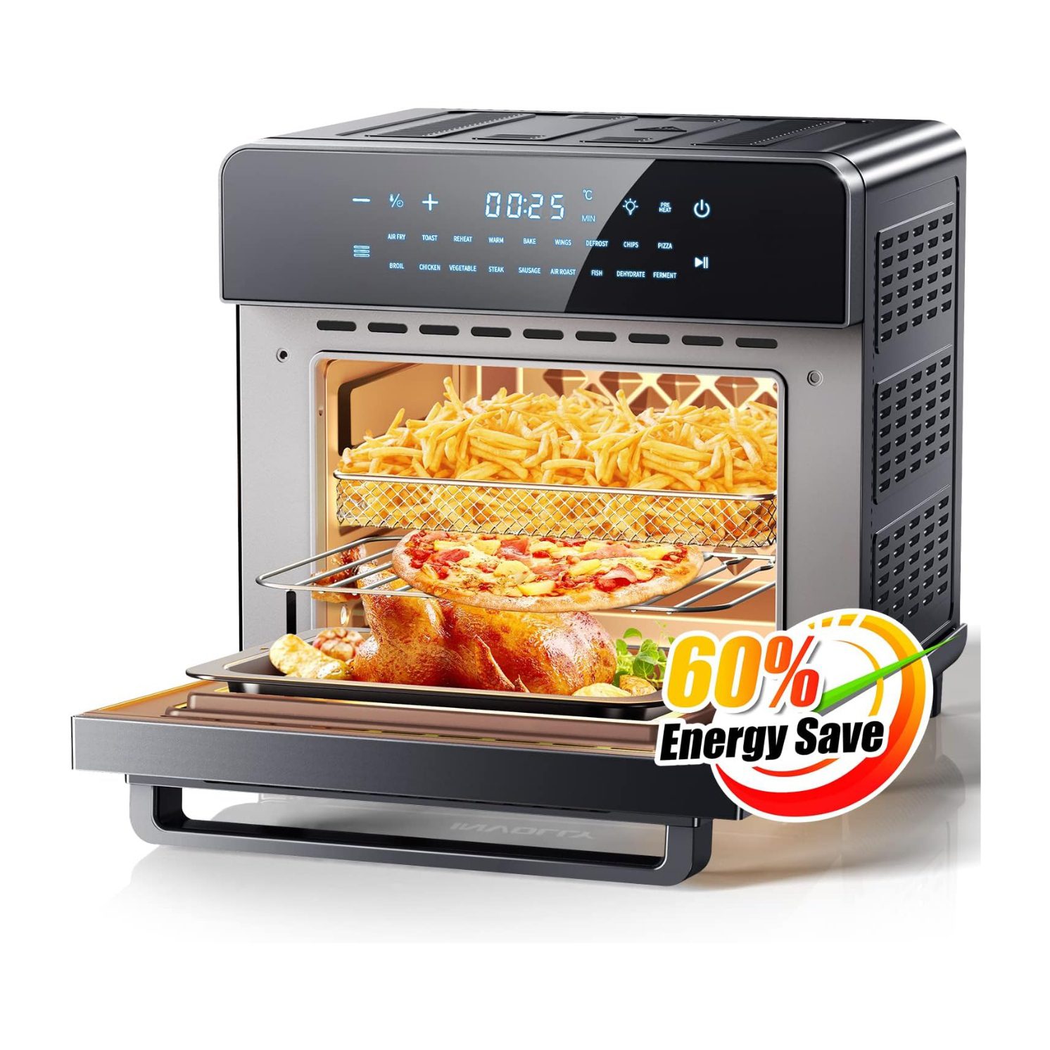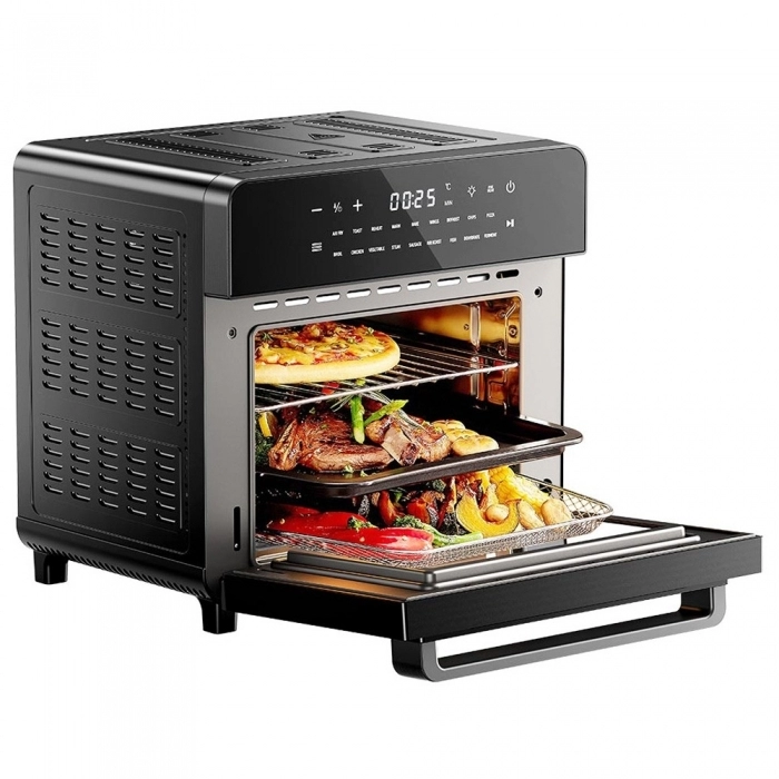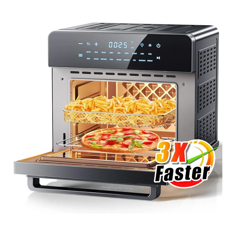 - تتميز بتقنية دوران الهواء الساخن عالي السرعة بزاوية 360 درجة، مما يجعلها أسرع ب 3 مرات وموفرة للطاقة بأقل ب 60٪ مقارنة بالأفران او القلايات التقليدية.