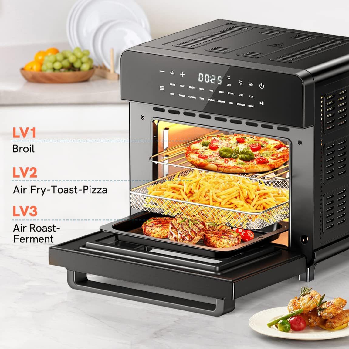 - تحتوي على 18 إعدادات معدة مسبقاً لتلبية كافة إحتياحاتكم وهي متعددة الاستخدامات (مثل القلي الهوائي ، الشوي، الخبز، إعداد البيتزا، وشوية الدجاج).