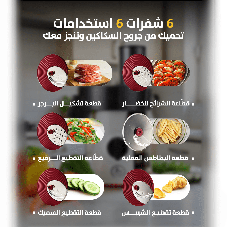 قطاعة متعددة الوظائف والإستخدامات وهي تعتبر حل عملي ومثالي سواء كنتِ ترغبين في تحضير سلطة طازجة، برش الأجبان للبيتزا والفطائر ، فرم المكسرات لتزيين الحلويات، إعداد سلطة فواكه لذيذة وغيرها من الإستخدامات بنتائج احترافية بضغطة زر واحدة، وبأشكال تقطيع متنوعة .